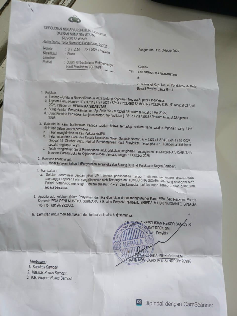 haba.co.id,SAMOSIR- Kasus dugaan pengancaman terhadap Veronika Sidabutar, dengan nomor LP/B/113/IV/2025/SPKT/POLRES SAMOSIR/POLDA SUMUT yang dilaporkan sejak 3 April 2025, hingga kini belum menemukan kejelasan di Kejaksaan Negeri Samosir. Padahal, berkas perkara tersangka TS telah dinyatakan lengkap (P21) oleh Kejaksaan Negeri Samosir pada 15 Oktober 2025.