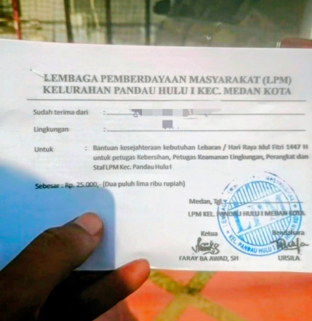 haba.co.id,MEDAN- Nama Lembaga Pemberdayaan Masyarakat (LPM) Kelurahan Pandau Hulu I, Kecamatan Medan Kota, tengah mencuat terkait isu pungutan liar. Beredar kabar adanya kutipan dana sebesar Rp25.000 melalui kupon bantuan kesejahteraan menjelang Idul Fitri 1447 Hijriah.