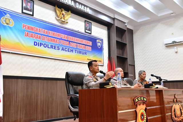 ACEH TIMUR – Dalam upaya memperkuat garda terdepan Kepolisian di tengah masyarakat, Direktorat Binmas (Ditbinmas) Polda Aceh menggelar kegiatan pembinaan dan peningkatan kemampuan (katpuan) Bhabinkamtibmas Polres Aceh Timur yang berlangsung di Aula Bhara Daksa, Selasa, (14/04/2026) pagi.