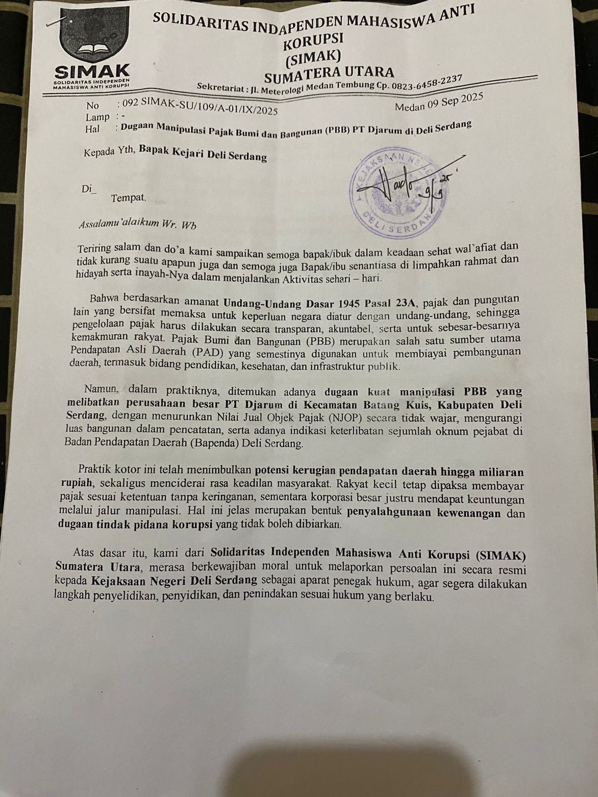 Haba.co.id| Deli Serdang – Solidaritas Independen Mahasiswa Anti Korupsi (SIMAK) Sumatera Utara secara resmi melaporkan dugaan manipulasi Pajak Bumi dan Bangunan (PBB) PT Djarum di Kecamatan Batang Kuis ke Kejaksaan Negeri (Kejari) Deli Serdang, Selasa (9/9/2025).