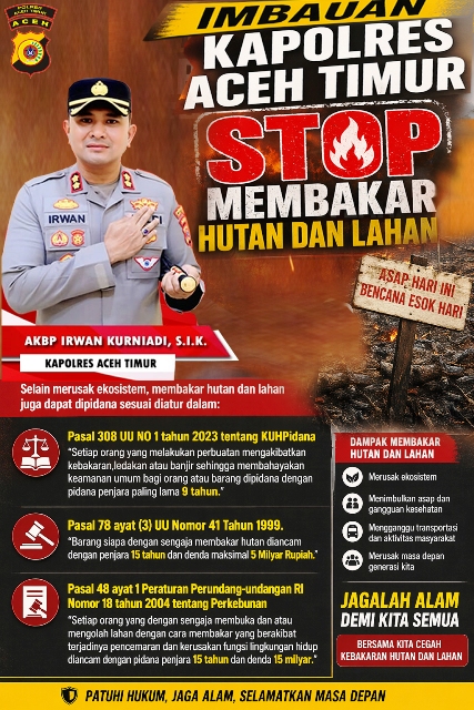 Kapolres Aceh Timur AKBP Irwan Kurniadi, S.I.K. mengajak seluruh masyarakat untuk tidak melakukan pembakaran lahan dalam bentuk apa pun. Selain itu, warga juga diimbau untuk segera melaporkan apabila menemukan titik api atau indikasi kebakaran di lingkungan sekitar.